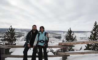 We both had a lot of fun on our 6 mile ski adventure. I know why more people ski in the backcountry rather than snowshoe. You can get further faster. However, we definitely need more practice on x-c skis before we go off on our own. We arrived back much earlier than our eight pm dinner reservations, and they were nice enough to seat us early. We had been quite amused at setting dinner reservations months in advance of our trip. we were told that it was needed, but while at Mammoth Springs very often we were either the only ones there, or one of maybe two or three groups. It turns out that many people had canceled their vacations recently due to the recession. At Old Faithful, the dining room was very often filled, so, yes the reservations were needed. Apparently, though, if we showed up at 5:30p, we could get seated early. any other time would have been hard.