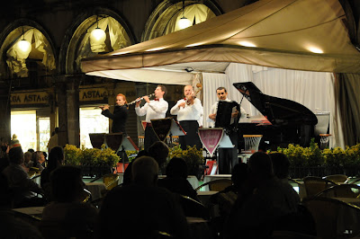 Italian food in Italy is indeed yummy. Mark had lasagna and I had some ravioli. For dessert, we wandered around until we found a gelataria. Gelato in Italy is delicious, too. More wandering and turning on streets with no particular direction in mind put ourselves in the famous San Marco Square with the San Marco Basilica and Doge’s Palace. Lining the square were multiple orchestra/band ensembles playing various tunes. We stopped at several to listen. I used various railings and spots on the ground as make-shift tripods to take some night photography.