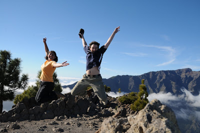 Finally, we reached the peak of Pico Benjado, nearly 1900 meters above sea level. What a marvelous view. From here we had a 360 degree view of the entire caldera. The clouds filled the caldera and we could see the U-shape clearly above the clouds. We could see across to where the famous observatory sits on the north side of the caldera. We could see down to where our car sat under a blanket of clouds. We could look out and guesstimate where our apartment sat under a blanket of clouds. We could see where the clouds dissipated over the sea and the sun shown yellow reflected in the ocean. We could see several more volcanoes that follow almost a linear path down to the south tip of the island. And of course we could see El Teide peeking out on Tenerife.