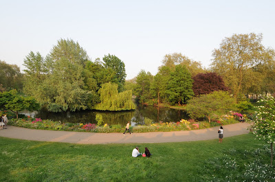I put my new rented wide-angle lens on my camera and went out to roam. On my way to Buckingham Palace, I found lots of unique little shops. There was a tea shop called About Thyme and nearly every Indian restaurant was called either Spicy World, or Spice Time. I found a cute little park full of tulips. The view was marred by all the homless sleeping in the grass, but the tulips were huge! The gift shops around the Palace were selling Will and Kate memorabilia. Everything seems to be all about the royal wedding these days. We will not be in London on the big day, April 29th, but it’s nice to see London getting decorated for the event. Across from the Palace was a garden full of flowers with the London Eye in the background beyond. My wide-angle lens was perfect for taking photos of Buckingham Palace itself. As I walked around the fountain in the middle of the blocked off roundabout, nearly everyone stopped me to borrow my shutter finger. I get this a lot when I walk around on my own with a DSLR hanging around my neck. One of these days I should walk around with my business cards and hand a card to everyone who asks me to take their picture.