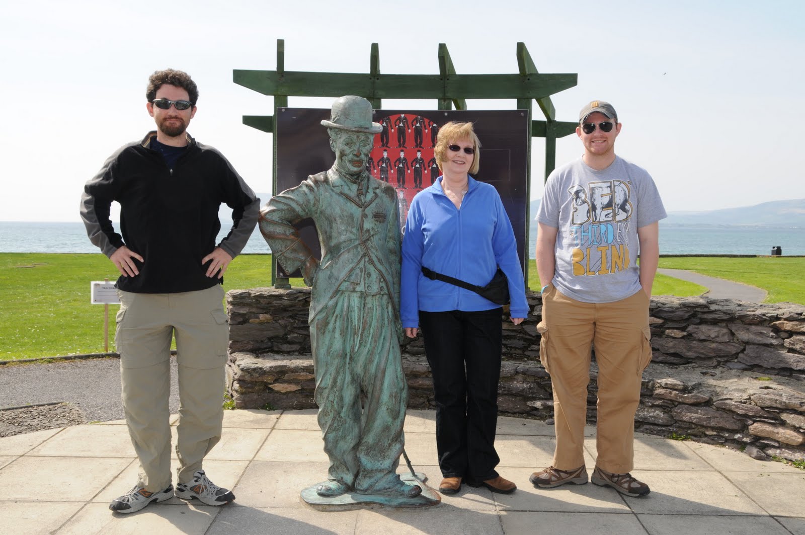 On our way to Waterville, which is down at sea level, we crossed Coomakesta Pass with it’s major pullout and viewpoint large enough for tour buses. Up here a local entrepreneur brought his lambs and dog up to sell photos to the tourists. It was windy on the pass, but the views over both bays. Waterville was home to Charlie Chaplin and his wife for some amount of time. This tiny town put up a sculpture of him right across from our lunch stop at a pub/restaurant. By now it was after 3pm and we were the only ones eating. They had good fish and chips, burgers, and fish burgers so we were happy. Across the restaurant was a little park and then views of the ocean. The sun was still shining happily down on us and we couldn’t ask for anything more.
