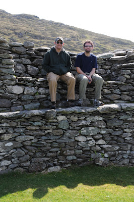 Finally we had our fill of pretending to be 10 again and headed down the road to the Cahergall and Leacanabuaile ring forts. The parking area off the side of the road was large enough for a couple cars and we were warned by hand painted signs to walk on foot from here on. The walks took us past the cows, horses, and donkeys. At one point, a donkey went absolutely crazy in the field down below. He was hee-hawing and running about. The sound carried well, and we all scrambled up to see what all the commotion was. Cahergall was the larger fort and had stone staircases leading up the wall much like the circles in Moray, Cuzco in the Sacred Valley of Peru. The steps weren’t the same, but both Mark and I were reminded of this Inca ruin when we climbed the various stepped levels in the Cahergall ring fort. Leacanabuaile was a smaller fort and seemed to have more of it’s ring banked up with soil rather than placed rock. We had fun climbing around this fort as well. Overall, these 3 locations provided a very fun way to end our Ring of Kerry tour and allow us to stretch our legs after sitting in the car for so many hours.