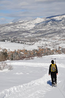 We woke up today to sunny skies. It was a beautiful day, so we took the day off skiing and rented some snowshoes. Most of the parks in the area are not accessible easily by the free city bus, so we headed over to a city park and ski area called Howelson Hill. It seems to be more of a small ski area for the locals. They train many Olympic athletes here and are open for night skiing. They have ski jumps, tubing, and for us today, nordic trails. We snow showed on the side of the cross country ski trails through a meadow area and them up the mountain almost to the top. It got up to about 32 today, so we were very warm and put our jackets in our packs and just wore our fleece. As long as we were moving we were comfortable if not warm. The sun was out and so were the people. We encountered many people cross country skiing, or just out jogging through the snow with their dogs. The skiers had their dogs with them as well. I don’t think we saw any dogs on leashes, but they were all very well behaved. With a clear day, we took the good camera out with us and got some good landscape shots. For the most part we stuck to the groomed trails, but had fun going “off roading” too. The snow here is so soft and powdery. Even in snowshoes we sink down to our knees. Without the snowshoes, I’m sure we’d be buried past our waist. It is also gorgeous snow because it sparkles like glitter in the sunlight. That’s the Steamboat Springs Champagne Powder.
