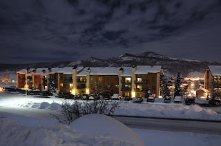 In order to be home in time for the BCS football championship game, we left the hill and headed back to the condo getting back by 6pm. It’s been a tiring week and a tiring day traipsing through the snow so we were happy to collapse in the condo. However, I manged to get up to get some night pictures. Steamboat tonight was very different from the rest of the days. The day was so warm that the snow had melted from the roads and the sidewalks had melted and were refreezing into ice. Everything was now dirty instead of the pure white snow we’d been seeing. But it was still a perfect night for photos because the almost full moon was out, the sky was clear, and it wasn’t crazy cold out.